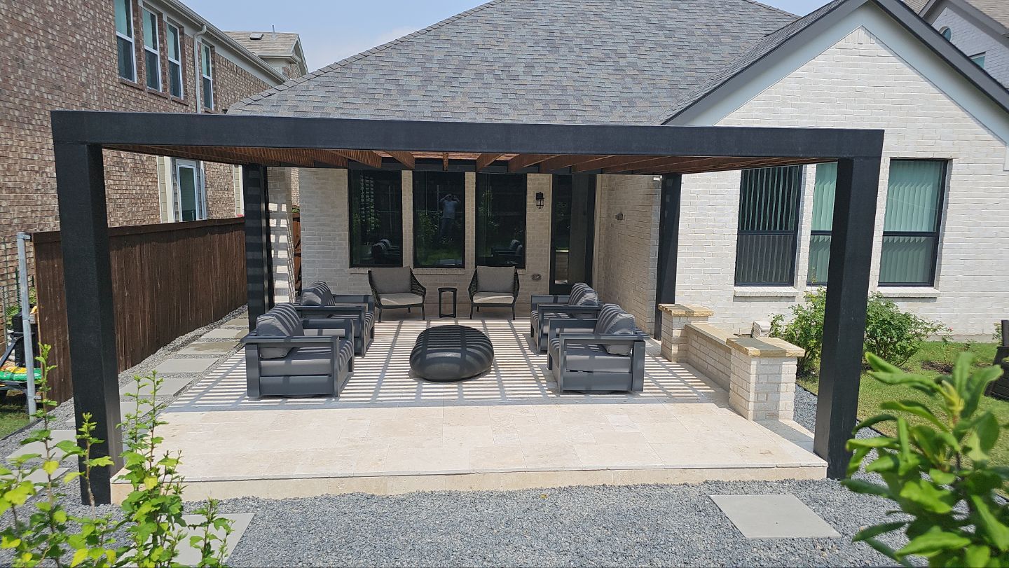 We added 2 Pergolas (with poly top), Travertine Paver Patios, Synthetic Grass and a Modern Seat Wall.
